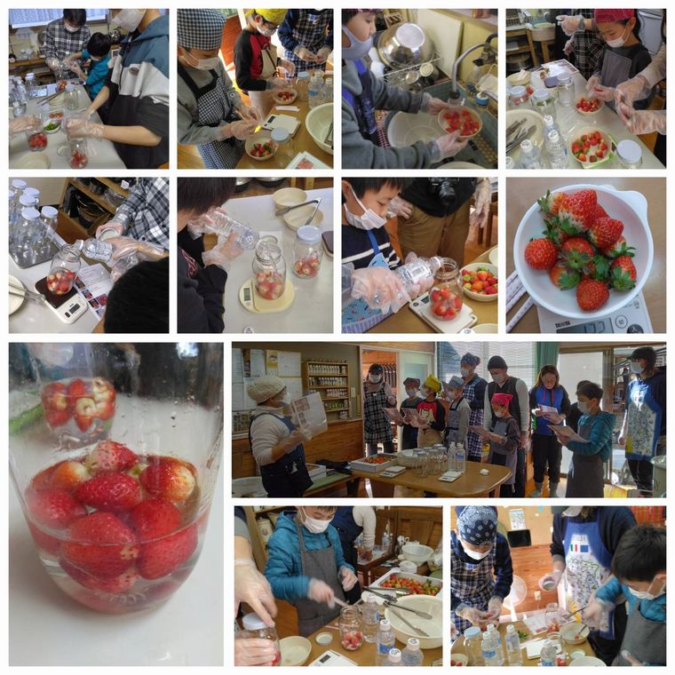 イチゴ酵母:イチゴ100gと水200ccを900ccの食用ビンに詰め、砂糖15gを入れて、スクール生が自宅で酵母菌を育てていきます。食用ビンは、煮沸消毒をして一旦冷やして使用します。