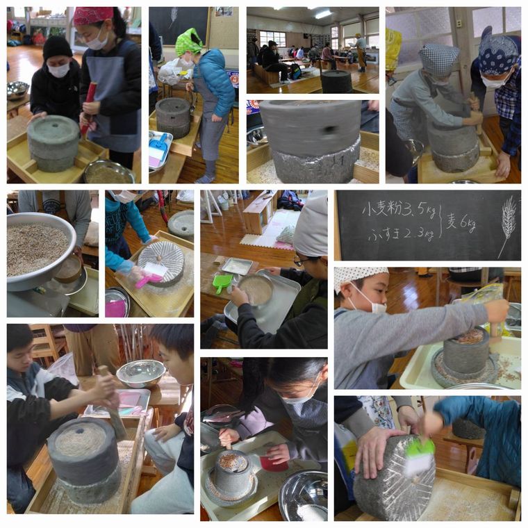午前中で、終わらなかった小麦を午前中と同じように石臼で挽いていきました。小麦6kgから、小麦粉3.5kgとふすま(粉にならなかった小麦)2.3kgを作ることができました。
