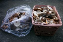 森林の再生活動最終回(植樹)が終ってから、椎茸の収穫をしました。もう暖かいので椎茸の傷み(傘が赤く変色)も早く、虫が付いている椎茸もあります。おそらく今日が、2006年度最後の収穫になります。今日の収穫高は約5kgで、森林の再生活動の参加者へのお土産となりました。