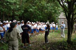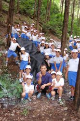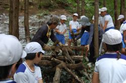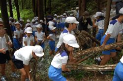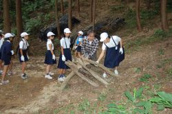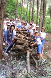 | 10時30分になり子どもたちが集まり、横山理事長のあいさつと森についての環境クイズ、林業家の河野さんからの椎茸栽培の話の後に、子どもたち全員で本伏せ作業を行いました。ほだ木を山斜面まで子どもたちが運んできて、本伏せを組んで行きました。子どもたちのにぎやかな歓声の中、本伏せ組みが終了すると子どもたちの記念撮影をしました。 | ![]() |