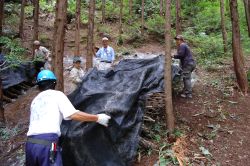 昨年、森林の再生活動の最終回で駒打ちをして仮伏せ状態にしていた17本のほだ木を本伏せ状態にしました。場所は、GOCANの森で杉林との境界付近で、西日があたらないように遮光ネットを張りました。