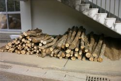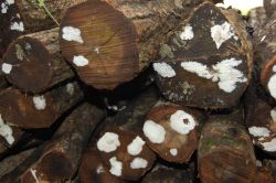 | 椎茸の発芽がたくさんありました。白くブツブツに見えるのが、発芽した椎茸です。もう少し暖かくなれば、多くの椎茸が収穫できそうです。今年になって、すでに11Kgの椎茸が収穫できています。 | 3月に小学校で実施する椎茸コマ打ちで使用する原木は、搬送しやすいように、2mで玉切りをして、小学校の非常階段下に仮置きしています。原木は、校長先生が、1mに玉切りしてくれます。 |