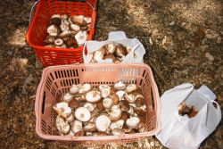 10月中旬まで暖かい日が続いていました。1週間前に雨が降り、やや冷え込みましたが、その後も暖かい日が続いていたので椎茸の発生も遅れているだろうと思い、ほだ場を行ってませんでした。今日、初めてのほだ場を見に行きました。そうしたら、1週間位前に発生したと思われる椎茸がありました。既に笠が開いてしまって、大きいもので20cm位に成長していました。大きくなってしまった椎茸は、乾燥が進み虫が付いて、もう食べれません。その中でも、食べ頃の椎茸をいくつか収穫できました。また、乾燥椎茸作りに、挑戦することにしました。
