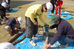 まず最初は、日向市ふるさとの自然を守る会の大野さんから、林業の話と椎茸栽培の話をしてもらい、横山純子理事から今日の作業説明の後、子どもたちが8班に分かれてコマ打ち体験を行いました。子どもたち自身が、ドリルを使って原木(クヌギ)にコマ穴を開けて、金槌でコマを打ち込んで行きました。1人が2本の原木にコマ打ちに挑戦しました。