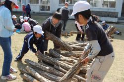 五十鈴小学校5年生(当時4年生)で、3月9日に実施した椎茸菌の原木への接種した後、仮伏せ状態にしていたほだ木をグランド横の山斜面に、ムカデ組みで本伏せ状態にしました。