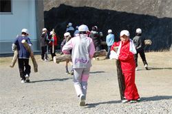 | 子どもたち皆で、ほだ木を運びました。重いほだ木は、2人で運びます。 | |