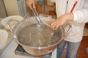 | 見る見るうちに塩が析出されます。シャーベット状(ジャリジャリ感)になってきます。 ろ過した海水を中火で煮詰めてシャーベット状になりまで5分もかかりません。常にかき混ぜながら注意深く。 ここの過程が一番盛り上がりました。全員が「おー、おー」と喚起に満ちた声をあげました。なめて本物の塩か確かめてみました。 |