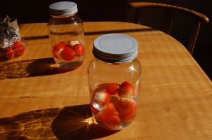 イチゴの酵母は、二通りの作り方を試します。手軽な酵母の育て方として、ひとつは、砂糖水の中にイチゴを浸し4日間かけて酵母を育てます。もうひとつは、水を使わずイチゴの水分だけで、2週間かけて酵母を育てます。酵母菌の繁殖が気温に関係するため、冬の気温が低い時期は、予定している日数以上かかると思われます。どちらも、密封できる瓶を沸騰殺菌してからイチゴを入れ、一日に数回振りかき混ぜ栓を開けて、瓶の中の空気を入れ替えます。