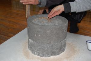 ![]() 石臼には少しずつ小まめに小麦を投入していきます。 |