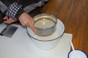 ![]() 細かい粉をふるい分けます。 |