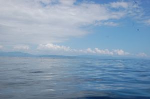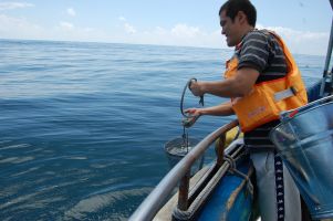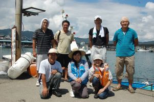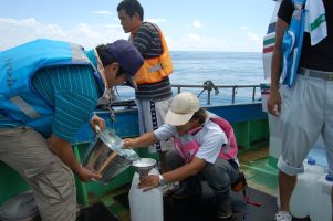 カンムリウミスズメの繁殖地として有名なビロウ島のすぐ近くまで、黒潮が来ることがあります。黒潮の海水が汲めることを期待したのですが、すいぶん沖まできたのに黒潮が見つかりませんでした。黒潮をあきらめて、湾を出た沖の海水を汲みことにしました。それでも陸地に近い海水とは比べると随分きれいな海水です。船長さんの話では、黒潮はもっと透明度が高くきれいな海水なのだそうです。