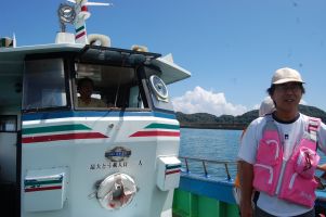 | 釣り人を歩いて行けない岩場に運ぶ瀬渡し船で海水を汲みに出発 | |