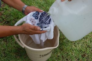 | さらし布を使って、海水の不純物を通り除きます。 今回は、10リットルの海水を使って塩を作ります。 海水の塩分は、約3.4%で、理論上では250gの塩がとれる計算になるようです。 |