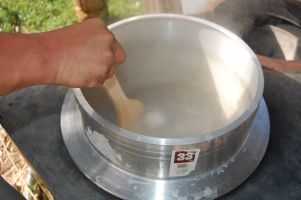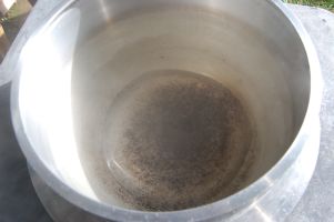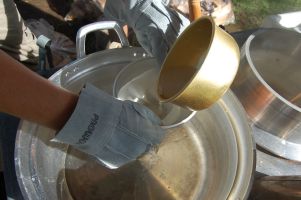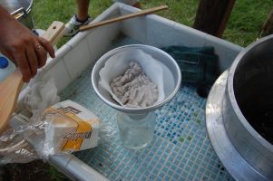 | 海水をかき混ぜながら、10分の1(1リットル)まで煮詰めたら、硫酸カルシウムが析出され海水が白く濁ってきます。硫酸カルシウムは、にがりなので、コーヒーフィルターなどでろ過して取り除きます。また、鍋の底などに付着している硫酸カルシウムは、こそいで取り除きます。 海水の量が、10分の2から10分の1くらいになるまで、約20分程度でした。 熱湯をろ過するので慎重に! 次の工程でも同じ羽釜を使うので、水で羽釜を洗いました。 |