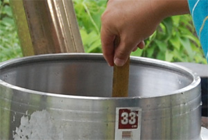 | 海水の量を調べるには、あらかじめ使用する鍋に水を入れて竹へらなどで水位を測りマークを付けておきます。 今回は、10リットルの海水を使ったので、羽釜に1リットル、2リットル、5リットルの水を入れ竹へらで水位を測り鋸目を付けておきました。 |