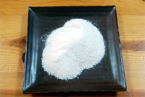| 左が塩です。右が途中でろ過して取り除いた硫酸カルシウムです。 硫酸カルシウムも、豆腐づくりのにがりとして利用できます。 |