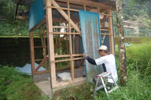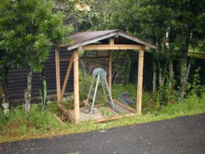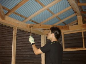 修理は、@斜め支え角材の交換、A立て支え角材の交換、B火打梁の増設置、C屋根の波トタンの一部交換。修理した結果、小屋の横揺れが止まりました。