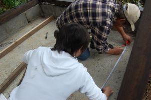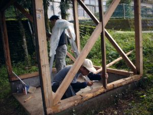 パン窯を作るためには、床の基礎が必要となります。新たに床の基礎工事をするのは大変なので、森の学舎で使用していない倉庫小屋に、パン窯を設置することにしました。この倉庫小屋は、シロアリで柱と支えがひどく被害を受けているため小屋全体が横揺れるするため修理することになりました。