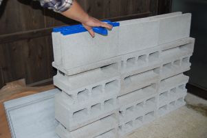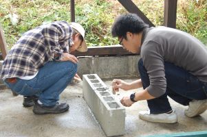 ![]() 水平をとりながら2段目のブロックを積みます。 |