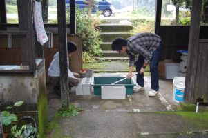 | 沖が遠くなりきれいな海で海水を汲む | |