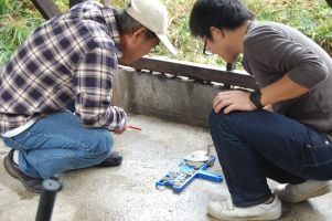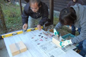 ![]() まず1個目のブロックを止めるためのセメントを塗ります。 |