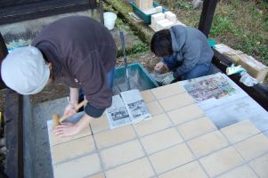 ![]() 窯の床を耐火セメントを使って耐火煉瓦を敷いていきます。 |