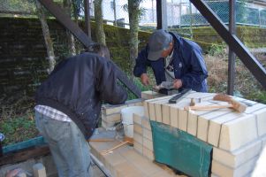 ![]() 木槌で耐火煉瓦同士を密着させていきます。 |