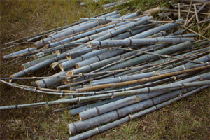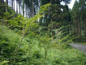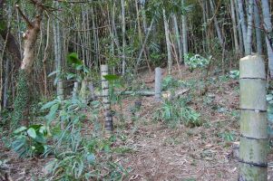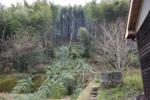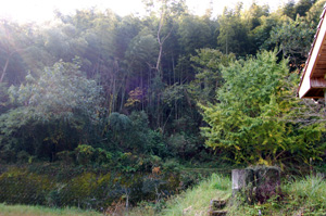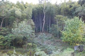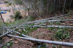 | 2009年9月から、森の学舎裏山の竹林整備を始めます。今回は、竹林がどうなっているかの調査を兼ねて、試しに竹を伐採してみようと言うことになり、急遽参加者4人で実施しました。自生しているヤマグリの周りを中心に、約20本の孟宗竹を伐採してグランドに落とし、グランドで枝を落とす作業をやりました。落とした枝は、粉砕機でチップ化する予定です。竹を伐採した場所は、明るくなり風が通りようになりました。竹林の本整備は、9月から開始します。