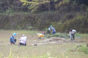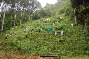 朝、8時50分に集合してから、高校生と一緒に、本部設営・簡易トイレ設置・道具を準備し、オリエンテーション(あいさつ、作業での注意、ストレッチ体操)を済ませて、作業を開始しました。小雨が降ったり止んだりと、若干天候に恵まれませんでしたが、参加者全員が一緒になって、約1時間で下草刈が終りました。休憩をはさんで、高校生は苗木の調査、他の参加者は、刈残しや櫨の木の刈払いを行ない終了したのは11時で、予定より1時間も早く終りました.。