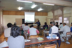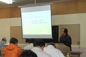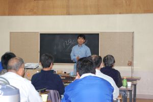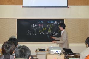 | 宮崎大学農学部準教授高木正博さんによる「森と環境の関係・里山概論」の講義 | |