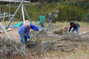 11月の竹林の整備は、10月31日に伐採した竹の後片付けをしてきました。粉砕機を使って竹をチップにするために、竹を1m程度の玉切りし鉈で4つ割や8つ割にして、粉砕できる程度の長さと厚みにしてから粉砕機でチップ化して行きました。また、太目の竹は、風呂小屋の壁にするために、竹割器で4つ割にしました。11月は3日間の竹整備をしたのですが、10月31日に伐採したすべての竹を後片付け整理することができませんでした。29日は、参加者の半分は風呂棟の整備作業を行いました。