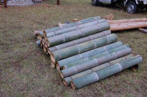 12月の竹林の整備は、再び竹を50本以上伐採して、伐採した竹の一部(15本)位を整理しました。今回は、竹の整理(後の使用法)は、@枝は二つ目の五右衛門風呂の壁に使います。笹葉が無くすためにグランドのすみに積み上げて置きました。A幹の太い部分は竹板にします。そのために1.4mに玉切りにしました。B枝と幹の太い部分以外は、粉砕してチップにします。