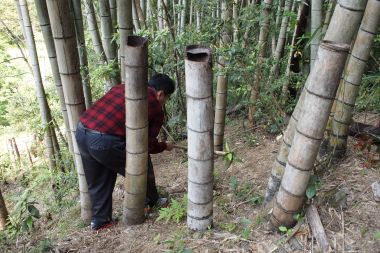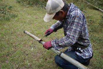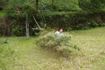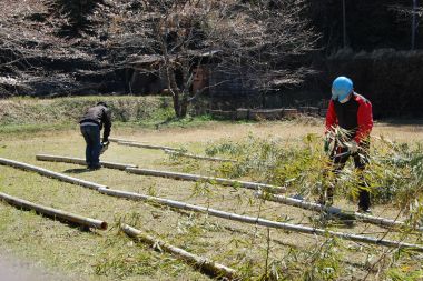 竹は胸の高さで伐採して、根元部分の4mを竹林に残してグランドに下ろします。竹林に残した根元部分は、竹棚として使用します。