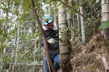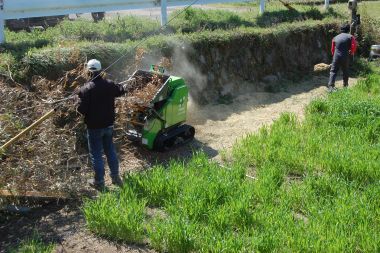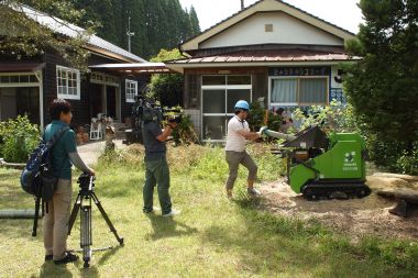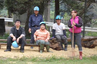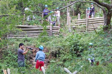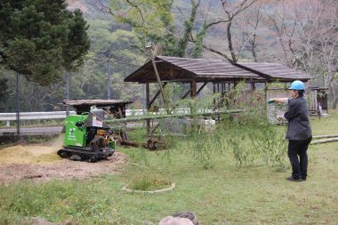 | イカダ用資材を切り出し | 草が茂らない様に土壌改良も兼ねてチップを散布 |