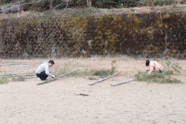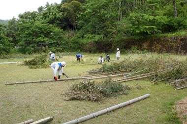 グランドでは、山斜面の竹林から下ろした竹の直径7.5cm部分から4mの長さに切り笹枝を取り除きます。この4mの竹は、ecoスクールのイカダ材料となります。子どもたちも一緒になって笹枝を落としていきます。