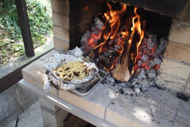 午前の作業は1時間で中断して、いつもの釜戸での炊飯とピザ焼きの準備にかかります。昼食休憩時間は、たっぷり2時間あります。準備をのんびりと進め、ゆっくりと昼食をとりました。