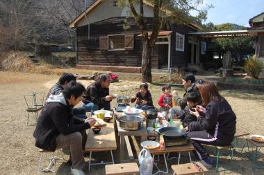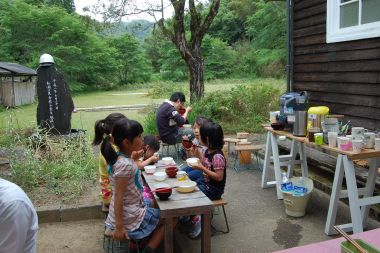 暖かい日だったので、釜戸でご飯を炊いてグランドで昼食をとりました。他に、パンケーキを焼いて参加者みんなで美味しくいただきました。
