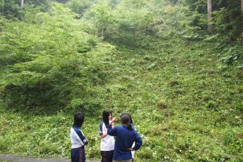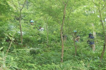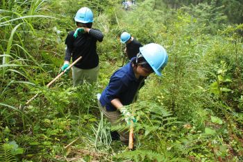 到着後、記念撮影とストレッチ、道具の準備、ヘルメットを着用して、下草刈りに入りいました。作業道も草が生い茂っており、作業道の草を刈りながら斜面上部の捕植した場所へ向かいました。途中小雨が降りましたが、本格的な雨にはならず、みんな大汗をかきかきの下草刈りでした。下草刈り終了後に、初めての参加した高校生は、看板に名前入れをしました。