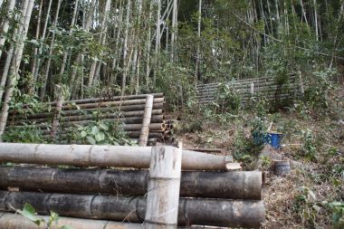 昨日(25日)に伐採した竹と1月に伐採していた竹から竹イカダ資材を作った残りの部分を粉砕し、新たに1月に伐採した跡の空間に竹棚を設置しました。