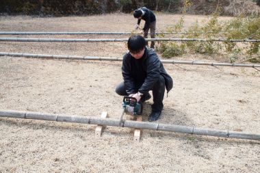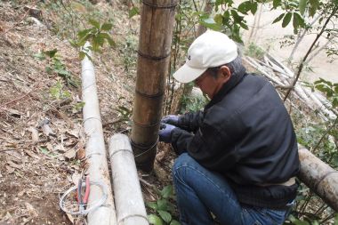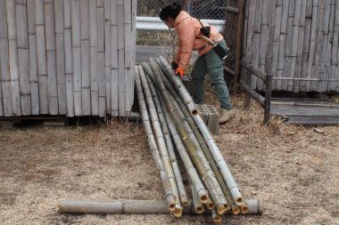 | 手前:修理、奥二つ:新規設置 | 竹を針金で支柱竹に括り付けて竹棚を作る |