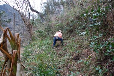 春に孟宗竹の子は猪に掘られていて、猪の掘り忘れは除去していたので、生えているのは孟宗竹以外の細い竹です。育林鎌で刈っていき竹棚に置いて行きました。作業に支障となる場所に芽吹いている櫨も刈りました。春からの竹林整備で必要となる作業道に茂っている枯草も除去しました。