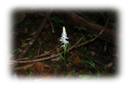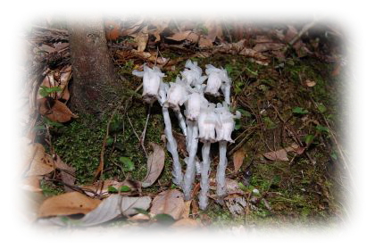 全体は白く葉緑素がないため、地下茎に共生する菌類からの栄養分で生長している。葉は退化し、りん片葉のみが、茎を抱くようにつく。
