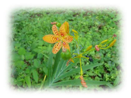 花は直径3〜5cmあり、鮮やかな橙色に暗赤色の斑点がある。