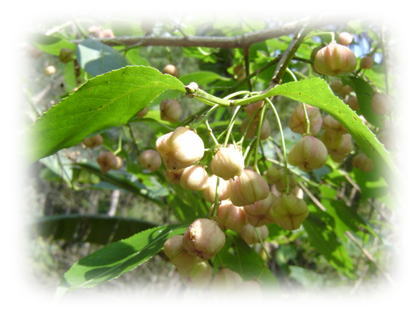 花序を伸ばし緑白色の小さな花を数個咲かせる。10〜11月には淡紅色で4陵のある果実が熟し、裂開して橙赤色の仮種皮に包まれた種子を出す。