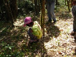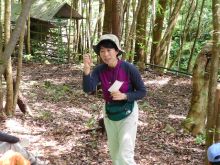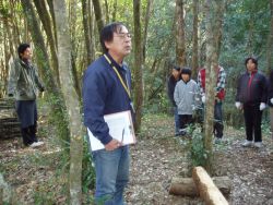 《樹木博士》 森林インストラクターの大野さんの案内で、雑木林から植樹地の前を通って、そして丸太橋を渡って棚田跡へ約1kmを歩き、山に生えている樹木の名前を教えてもらいました。樹木博士と一緒に、クヌギ・アラカシ等のドングリを拾っていきました。