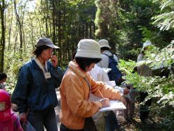 | 大野さんによる樹木の説明 | 木の葉の香りを確認、樹木の名前を記録 |