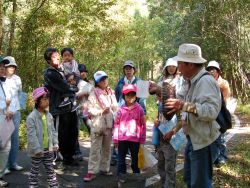 宮崎県ネーチャーゲーム協会の古田さんと黒木さんが、ネイチャーゲームの案内人です。今日のネイチャーゲームは、@音いくつ、Aカモフラージュ、Bフィールドビンゴ、Cミステリーアニマルの4種類です。
