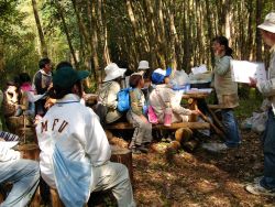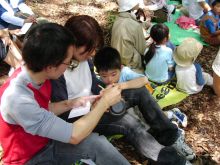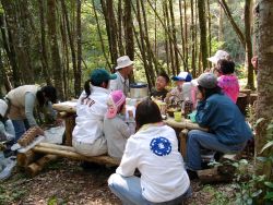 《昼食》 各参加者が持参したお弁当を、好きな場所にシートを張って食べました。でも、時間が経ったら、森のベンチにみんな集まって来て、おしゃべりが始まりました。![]() |