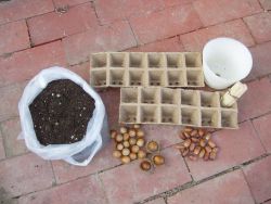 | 参加者に渡したドングリ育苗セット | 紙製苗パットにドングリを植えます |