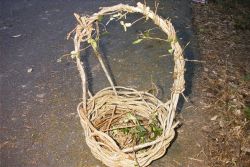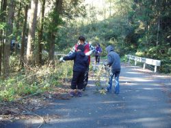 | 《つる工作》 作業がやり易かったのか、ほとんどの参加者は道路で、かごやリースを製作してました。今日は、猪狩の車が多く往来し、猟師の方には、ご迷惑をかけました。 皆さん作業に夢中で、昼ご飯1時が過ぎとなりました。 |